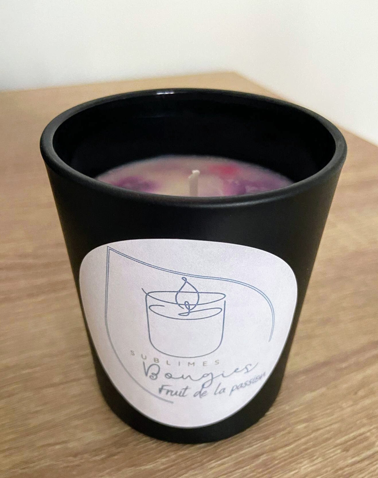 Cette bougie à l'odeur du fruit de la passion a une légère touche colorée rose et mauve, rappelant les couleurs du fruit.